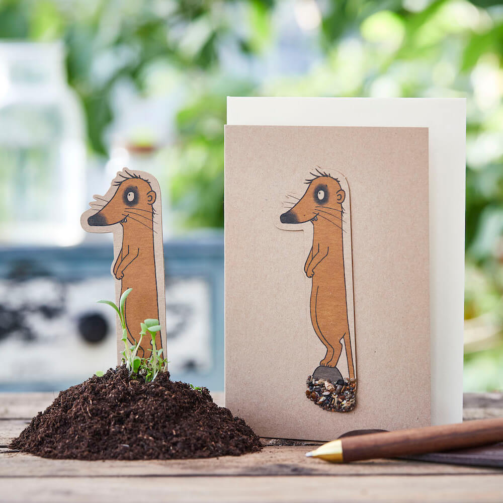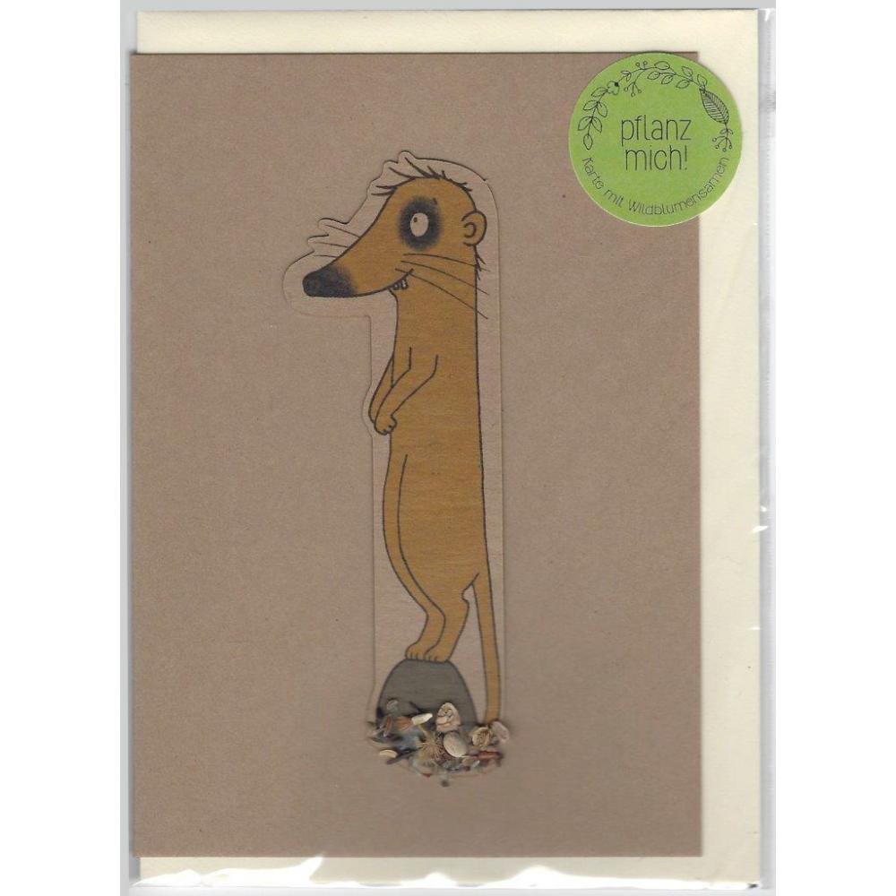 Saatsteckkarte von Die Stadtgärtner mit einer angehefteten Form aus dicker Pappe hergestellt und im unteren Teil mit einer Menge Saatgut bestückt. Die Form einfach von der Karte ablösen in Erde stecken und gießen- die Form löst sich dabei nicht auf, sondern verwächst sich langsam im bunten Grün.