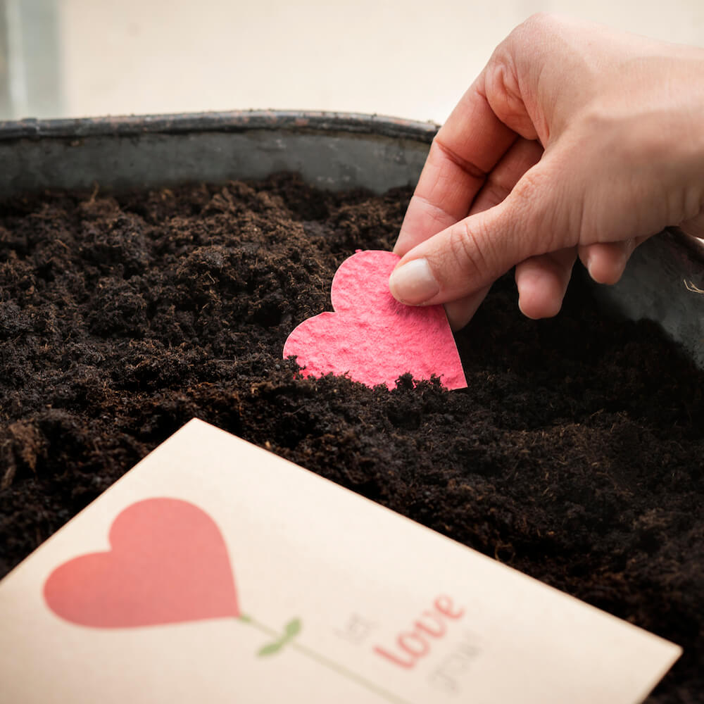 Das angeheftete Herz besteht aus handgeschöpftem Saatpapier. Nach