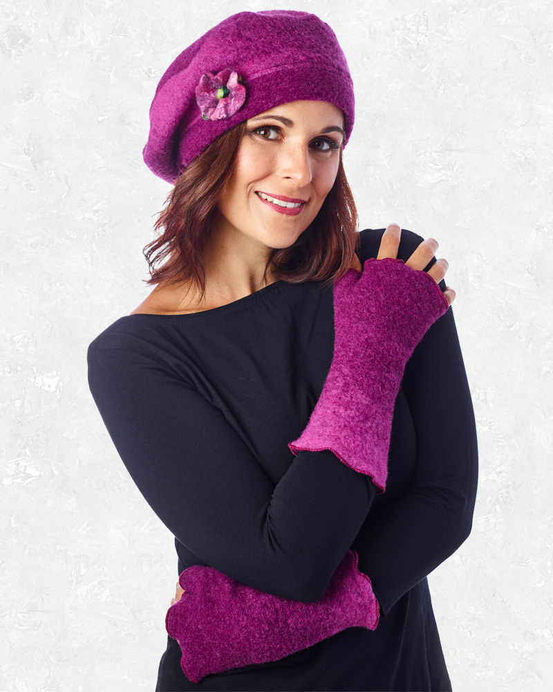 Schöne Basekenmütze in pink mit Filzblume aus 80% Wolle/ 20% Baumwolle von Anra aus Rothenburg.