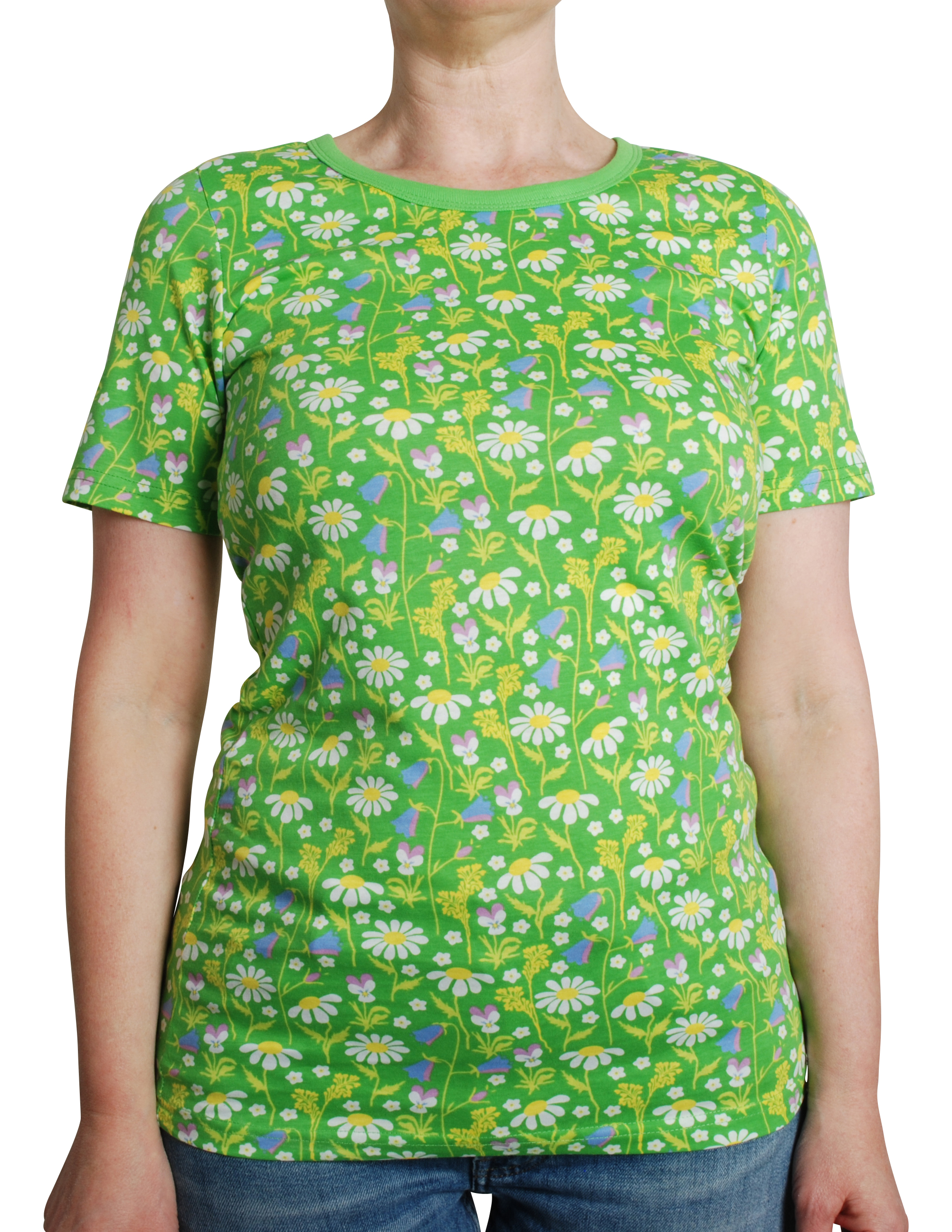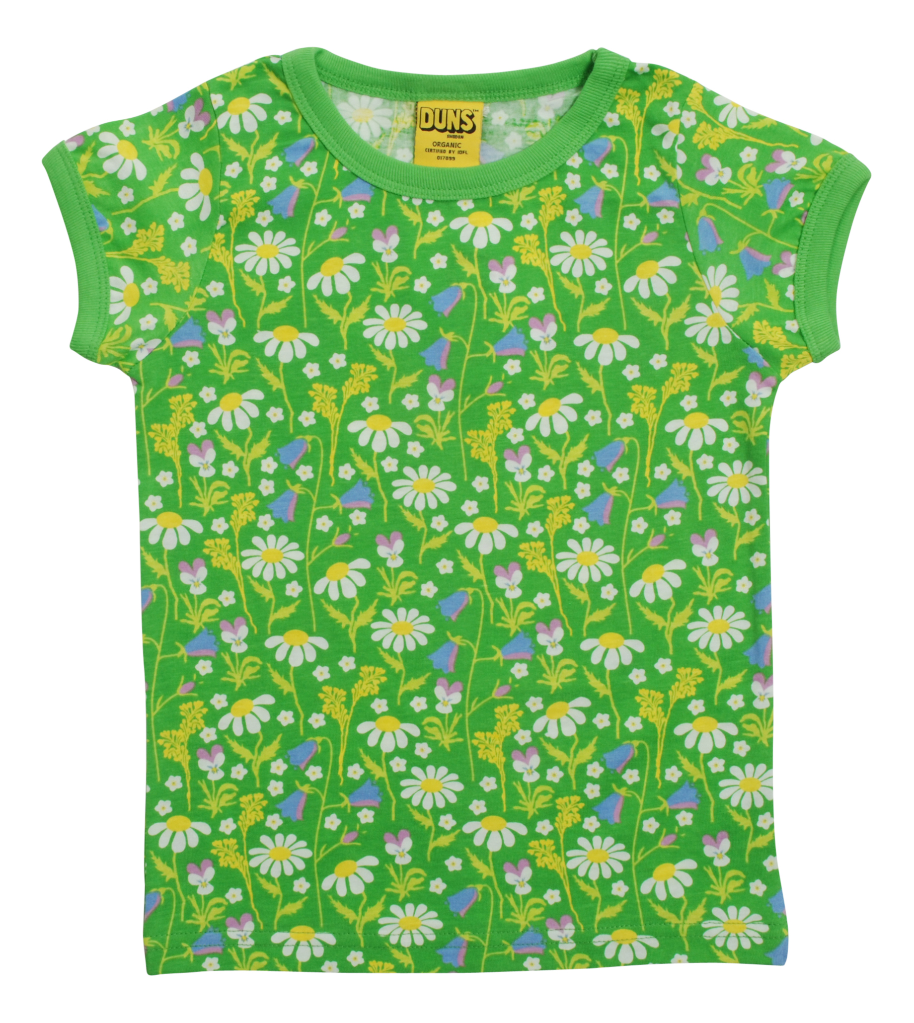 Schönes blumiges und weiches Sommer T-shirt Blumenwiese von DUNS sweden aus 100% Baumwolle kbA. Wohfühlen mit Glockenblumen, Stiefmütterchen und Kamille. Falls Sie im Partnerlook mit Ihren Kindern los wollen kein Problem - es gibt auch in Kindergrößen T-shirts, Kleider und Bettwäsche.