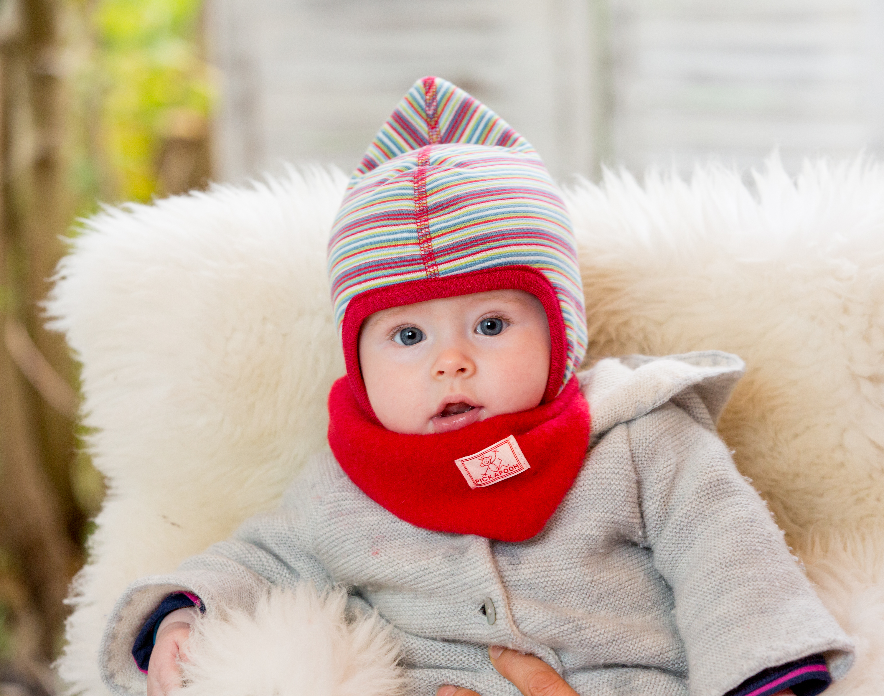 Die schlichtere Variante vom Dreiecktuch Wollfleece mit Ringelfutter. Immer einfarbig natur oder dunkelblau gefüttert. Aussen 100% Schurwolle kbT, innen 100% Baumwolle kbA. Immer mit Klettverschluss.