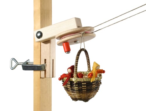 Die Körbchen Seilbahn besteht aus 2 Stationen, um die das Seil wie bei einem Sessellift rundum läuft. Die Stationen werden mit den beiden beiliegenden Zwingen an Tischkanten, Regalen oder Ähnlichem befestigt. Die geflochtenen Körbchen hängen fest am Seil und können von den Stationen durch Kurbeln bewegt werden.